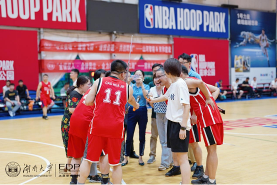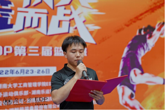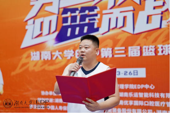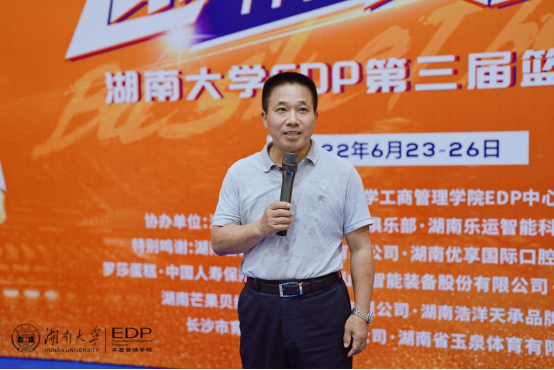 湖南大学工商管理学院EDP中心李平主任代表中心对本次篮球赛的举办表示热烈的祝贺,他说此前由于疫情,中心停课半年,今日在球场看到学员意气风发的状态感到十分欣慰与亲切,在特殊时期举办本次篮球赛有着特殊的意义。