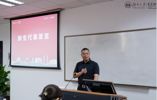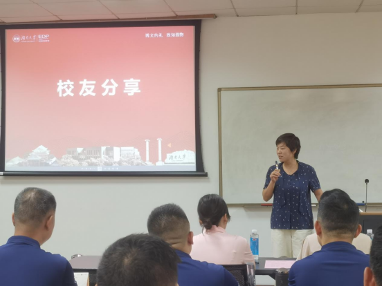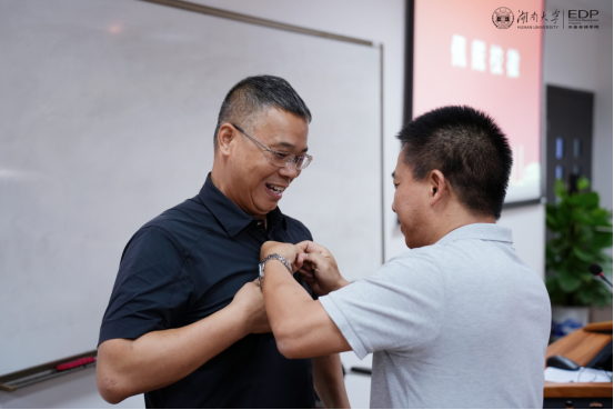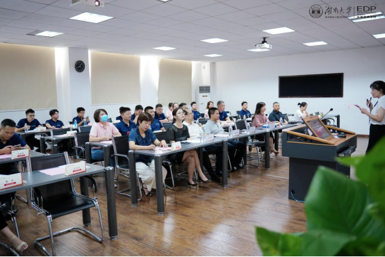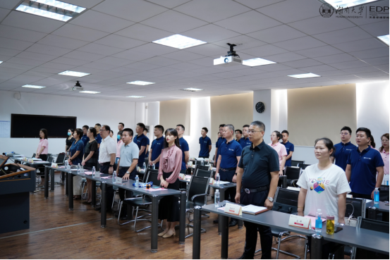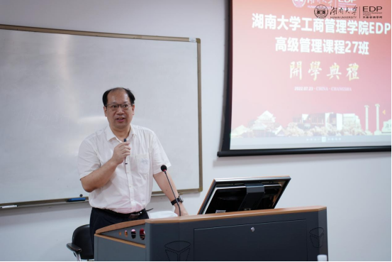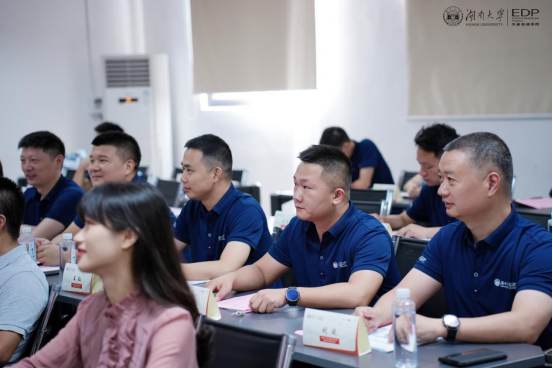 易洪波副书记首先在致辞中代表学院对各位学员的加入表示热烈欢迎。他介绍了湖南大学的千年历史、工商管理学院的发展历史以及学科优势,并传递了学院知行合一、正道致远的商学精神,让学员们更深入地了解了湖大商学独有的文化气质。易洪波副书记希望大家能以“博学之、审问之、慎思之、明辨之、笃行之”的态度致力于终身学习,并把学习的成果转化为创新工作发展的新思路、促进事业前进的新举措,为企业的发展做出卓越贡献。
