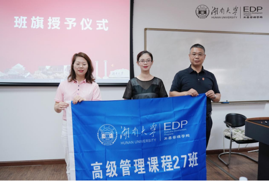 石丹彬副主任为高管27班授予了班旗。新的班级,新的启航,从授完班旗的这一刻起,希望高管27班的每一位学员,经过未来在湖大的系统学习,能够成长为更加有胸怀、有格局、有温度、有正义感、有责任感的企业精英,能够用自身所学帮助企业实现从优秀向卓越的蜕变,共同打造出一支无愧于新时代的商界湘军,为中华民族伟大复兴贡献一份力量。