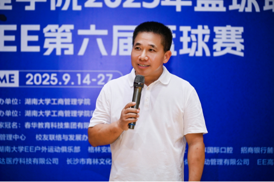 本届赛事的冠名商代表,春华教育科技集团有限公司董事长周乐顺祝贺赛事开幕,并表达了对高校体育事业和校企融合的支持。他肯定了篮球赛对促进交流、激发团队精神的重要作用,预祝各队取得优异成绩。
